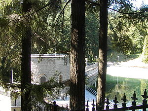 Four of the reservoirs were done in Ernest Ransome's patented reinforced-concrete system, so early they were considered experimental at the time. The rounded pumphouses, which look like rough medieval stonework, are poured concrete etched to look like stone. They're listed on the National Register of Historic Places.